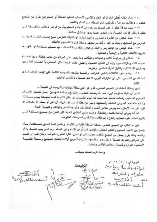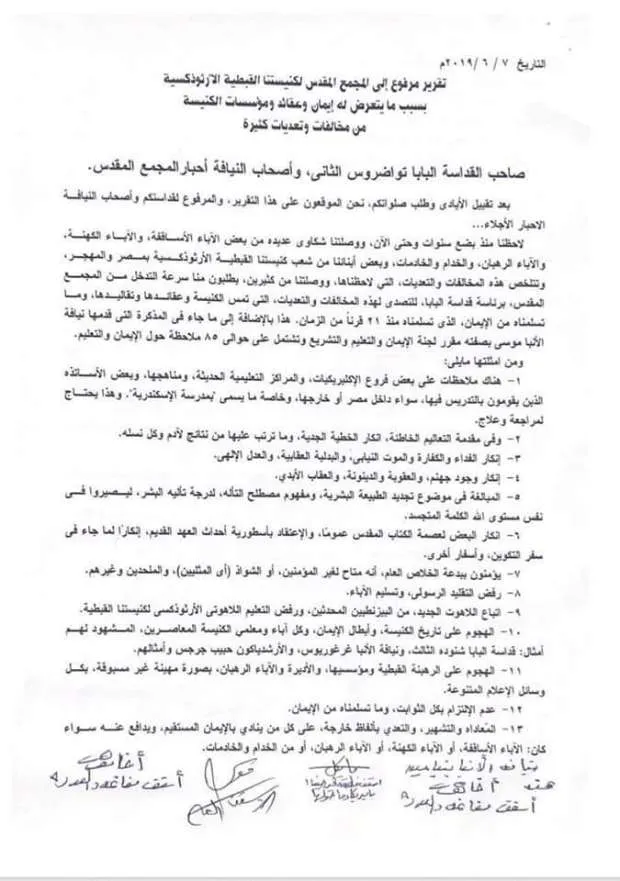 فجأة وبدون مقدمات خرج علينا في هذا الأسبوع بيان بتاريخ 11 أكتوبر 2024، عليه أسماء 17 مطران وأسقف من داخل مصر وخارجها دون توقيعات، يعترضون على المشاركة في السيمنار المنعقد بين 18 إلى 21 نوفمبر المقبل بدعوى وجود شخصيات تم دعوتهم لإلقاء محاضرات على أساقفة المجمع ولديهم اعتراض على أفكارهم وتعاليمهم، وطالبوا في الخطاب الموجه للبابا تواضروس والأنبا دانيال سكرتير المجمع بتغييرهم.