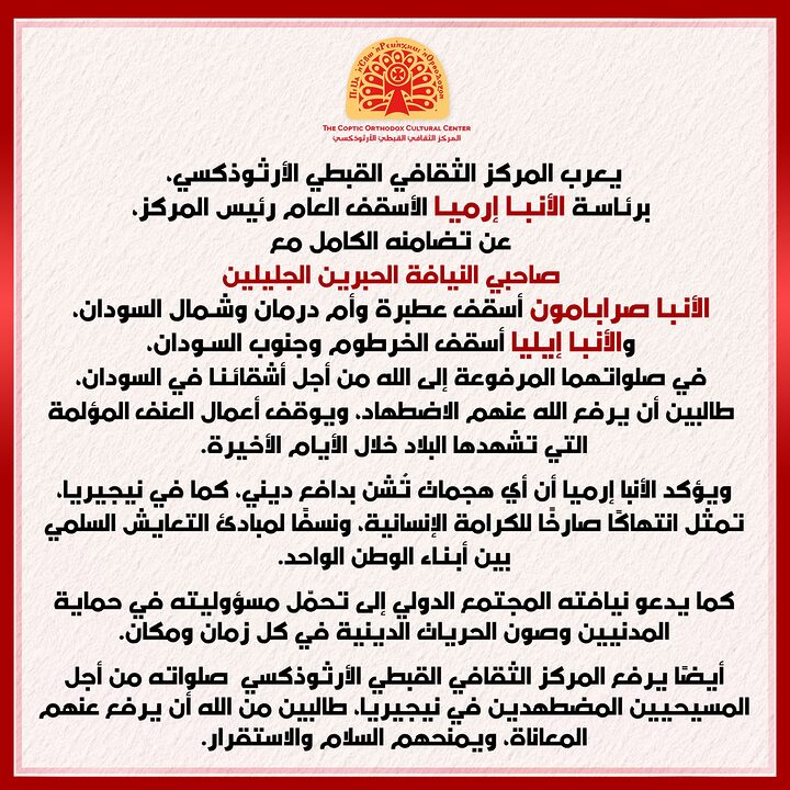 يعرب المركز الثقافي القبطي الأرثوذكسي، برئاسة نيافة الحبر الجليل الأنبا إرميا الأسقف العام رئيس المركز، عن تضامنه الكامل مع صاحبي النيافة الحبرين الجليلين الأنبا صرابامون أسقف عطبرة وأم درمان وشمال السودان، والأنبا إيليا أسقف الخرطوم وجنوب السودان، في صلواتهما المرفوعة إلى الله من أجل أشقائنا في السودان، طالبين أن يرفع الله عنهم الاضطهاد، ويوقف أعمال العنف المؤلمة التي تشهدها البلاد خلال الأيام الأخيرة.[1](الأنبا إرميا، صفحة المركز الثقافي القبطي على فيسبوك)