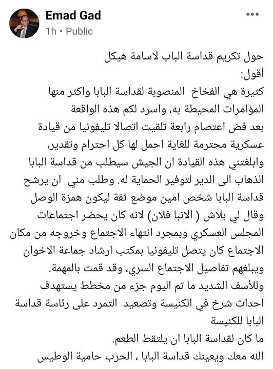 وﻻ يترك اﻷنبا إرميا مناسبة، سواء تخصنا داخل مصر أو ﻻ تخصنا إلاّ أصدر بيان باسمه بصفته رئيسًا للمركز الثقافي القبطي، وكأنه هيئة أو مؤسسة لها كيان اعتباري منفصل وﻻ تتبع كنيسة اﻹسكندرية القبطية اﻷرثوذكسية، فلا يوجد ذكر للبابا تواضروس، أو لبطريركية اﻷقباط اﻷرثوذكس كما هو متبع في مخاطبات البطريركية واﻹيبارشيات الرسمية في بياناته، ومنذ 10 أيام خرج علينا ببيان غريب غير مترابط، فقد بدأ وكأنه يتحدث في موضوع ثم نقل على موضوع آخر، فلم نفهم ماذا يريد أن يقول؟ وما علاقة أن تبدأ بالحديث عن السودان ثم في الفقرة التالية تتحدث عن نيجيريا؟