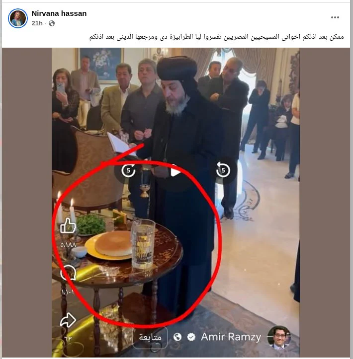 منذ أيام، انتقلت إلى السماء السيدة الفاضلة مارجريت الوحش. والدة الفنان هاني رمزي، والمستشار أمير رمزي، والمحامي والنائب السابق إيهاب رمزي. أعانهم الله على ألم فراق الأم. المستشار أمير رمزي كان يشارك عبر صفحته صورًا لكل شيء في مراسم تجنيز السيدة والدته، ومن ضمنها الصورة المرفقة، التي لفتت انتباه باحثة الإيچيبتولوچي المؤثرة؛ نيرڤانا حسن، وبالأخص محتويات الطاولة التي يقف أمامها نيافة الأنبا إنيانوس، أسقف بني مزار والبهنسا.